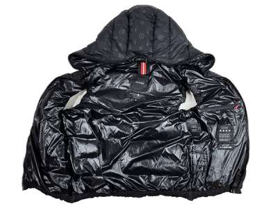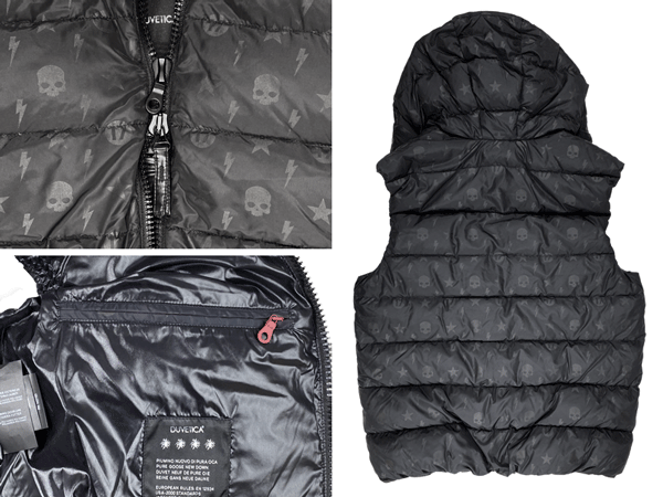 【仕様】全体に骸骨スカルとサンダーボルトとスターと17のプリント柄入り、正面上部のジッパー持ち手と内ポケットジッパー持ち手にDUVETICAロゴ入り、両サイドにジッパーポケット付き、左内側にダウンの4つ星タグとジップポケット1、袖口にはシャーリングゴムを採用、シリアルナンバー入り、ブルガリア製、※多少細かいキズやしわ等有る場合がございます。