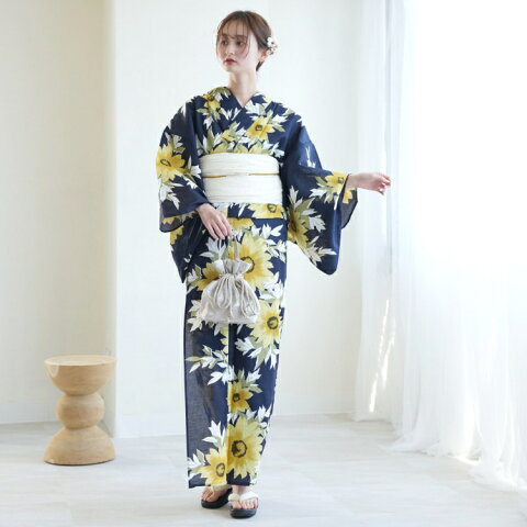 【60%OFF】浴衣 3点セット(浴衣/帯/下駄)Lサイズ 大きいサイズ トールサイズ 165cm〜175cm ひまわり 紺 黄 白 昭和初期アンティークデザイン復刻版 浴衣セット ゆかた 女性 レディース レトロ 大正ロマン 古典柄 モダン